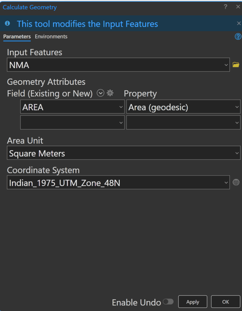 แต่อันนี้ก็มีข้อสังเกตอยู่อย่างหนึ่งว่า สมมติ shapefile โดนตั้งค่ามาเป็น WGS 1984 เราคำนวณในระบบดาตั้ม 1984 แล้วได้ค่าหนึ่ง แต่พอแปลงค่าจาก 1984 มาเป็น Indian 1975 โดยการตั้งค่า data frame property อาจจะได้ค่าอีกอย่างหนึ่ง