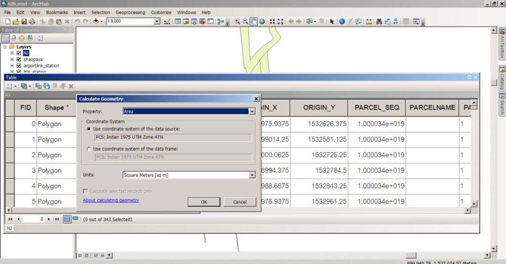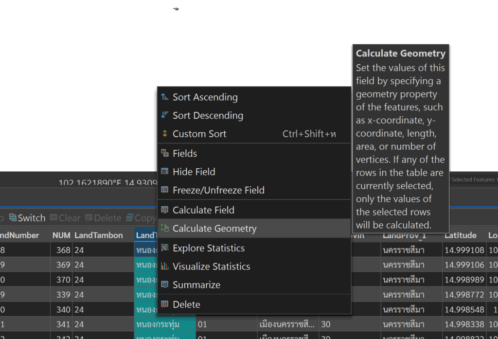 แต่ตรงนี้ถ้าใครทำงานในระบบ GCS (Geographic Coordinate System) เมื่อกด calculate geometry จะขึ้นสีเทาคลิกและใส่อะไรต่อไม่ได้ เพราะฟังก์ชันการคำนวณพื้นที่จะต้องเป็น PCS (Projected Coordinate System) เท่านั้น