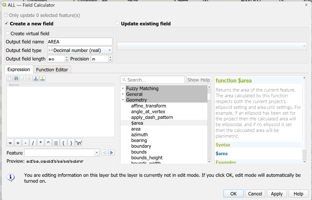 สิ่งหนึ่งที่มือใหม่ต้องสงสัยแน่ ๆ ว่าใน ArcGIS จะมีให้เลือก 2 เนื้อที่สองแบบคือ area กับ area (geodersic) ส่วนใน QGIS จะเป็น area กับ $area