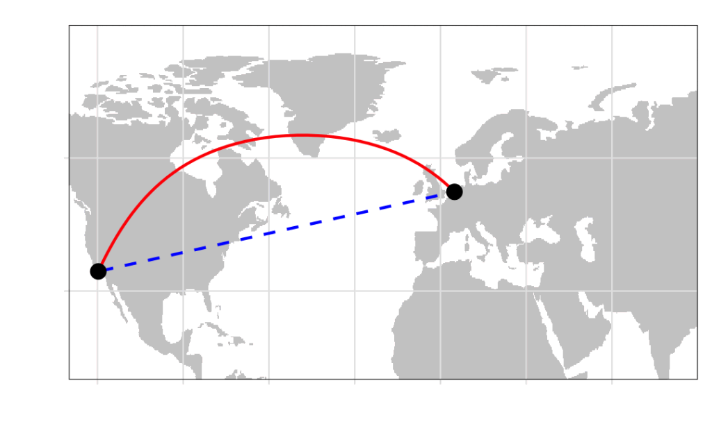 ยกตัวอย่างเช่น กรุงเทพ ถึง ขอนแก่น ระยะวัดตามส่วนโค้งของเปลือกโลกอยู่ที่ประมาณ 390 กิโลเมตร แต่ถ้าวัดแบบแบนราบเหมือนวัดกระดาษ จะอยู่ที่ประมาณ 400 กิโลเมตร แต่ถ้าเราขยับไปวัดระยะทางตามเส้นโค้งเปลือกโลกจาก ลอนดอน ไปยัง สตอกโฮล์ม ถ้าใช้วิธีวัดตามเส้นโค้งเปลือกโลกจะได้ระยะประมาณ 1,441 กิโลกเมตร แต่ถ้าวัดแบบแนวระนาบ จะได้ถึง 2,542 กิโลเมตร ระยะทางตามระนาบจะบิดเบือนเกือบสองเท่าของระยะทางตามระนาบจริง!