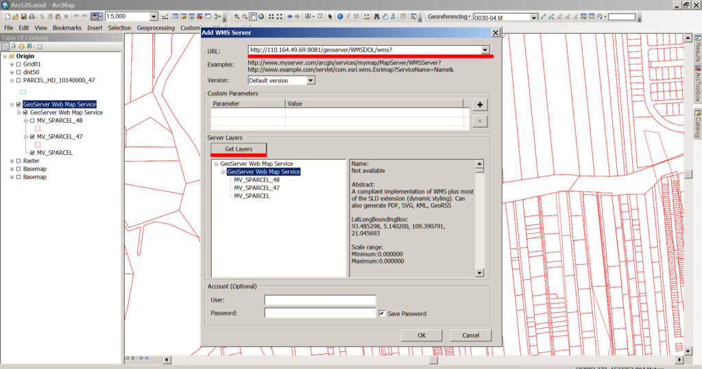 ใน ArcGIS ใช้ Add DATA ธรรมดานี่เอง เพียงแต่เลือกเป็น GIS Server เมื่อเลือกแล้วก็เลือกเป็น WMS แล้วจะมีหน้าต่างขึ้นมาให้ใส่ URL ซึ่งของกรมที่ดินในตัวอย่างนี้จะเป็น